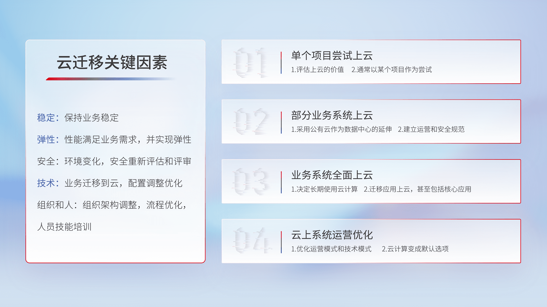 结合实际业务,,从规划设计、、云平台选型、、、云原生改造、、、、数据迁移、、集成交付,,,,迁移全过程为客户识别最佳上云路径,,做好风险识别管理,,设计网络架构、、身份权限、、、安全审计合规、、、、操作审计、、、日志审计、、监控告警策略、、、、多站点容灾设计等,,,,对云上基础设施进行整体规划,,,,提升IT治理水平,,以满足弹性、、高可用、、高性能的需求。。。